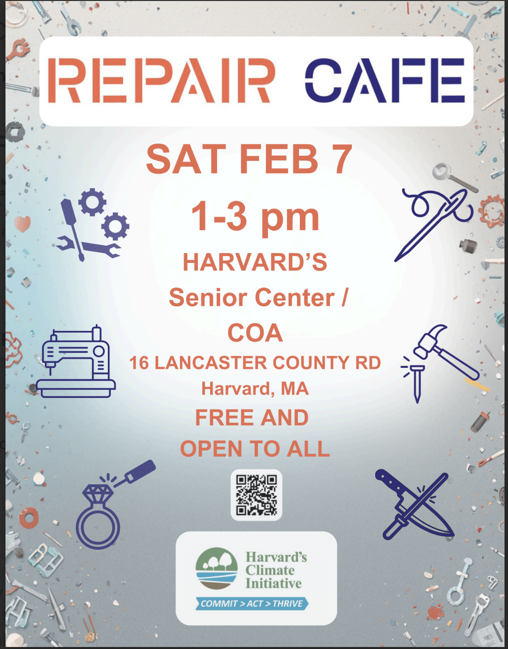 Harvard Climate Initiative Committee organizes a Repair Café What do you do with a broken toaster, scissors that no longer cut, or a sweater with moth holes? Toss them? No way! HCIC is organizing the town’s first ever Repair Café at the Harvard Senior Center/COA, 16 Lancaster County Road, on Saturday, February 7th, from 1:00-3:00 pm. Volunteer repair experts will be available to make repairs free of charge for small electrical appliances, clothing, furniture, toys, and many other broken items. Visitors are asked to bring an item from home, plus one or two spares. If time permits, our repair experts will try to fix them all. Repairs of broken items will reduce the volumes of waste that fill our landfills, will save money, and will build community with neighbors helping neighbors. For more information or to pre-register (highly encouraged!), please visit https://harvardmaclimateinitiative.org.