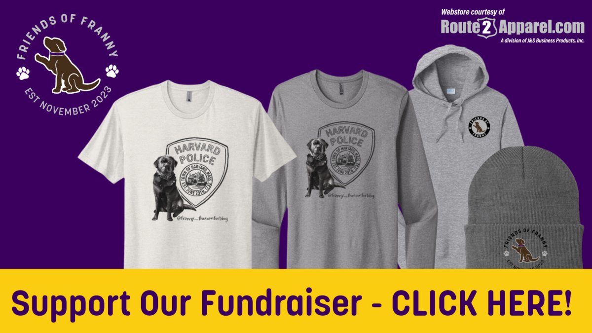 Franny apparel is available for purchase for the first time ever! Franny and Officer Tim are raising funds to help with Franny's care and continued training. A portion of all proceeds from this fundraiser come back to benefit Franny and her comfort dog endeavors.
